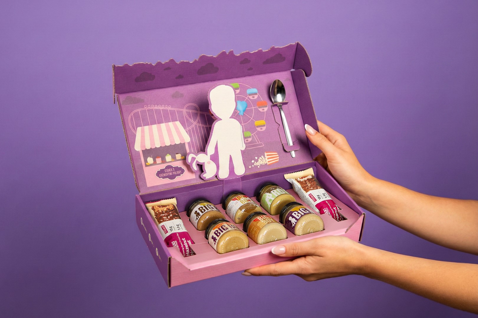 Láskyplný degustační set je malá chuťová jízda plná radosti. V jedné krabičce tě čeká šest mini máslíček, se kterými projedeš celý pouťový okruh BIG BOY chutí, a k tomu dvě proteinové tyčinky jako sladká tečka na závěr. Samozřejmostí je i lžička, protože každá správná jízda má svůj rytmus. Hravý pouťový design, chlapeček s 3D balónkem v ruce a atmosféra, která připomíná vůni sladkostí a smích z kolotočů, dělají z tohoto setu dárek, který baví ještě dřív, než ho otevřeš. Limitovaná edice, která vznikla pro radost, ochutnávání a malé chuťové dobrodružství. Ať už jako dárek, ochutnávka nebo jen tak pro sebe. Láskyplný degustační set je pozvánka na pouť chutí, ze které se ti nebude chtít odejít. 🎠💜