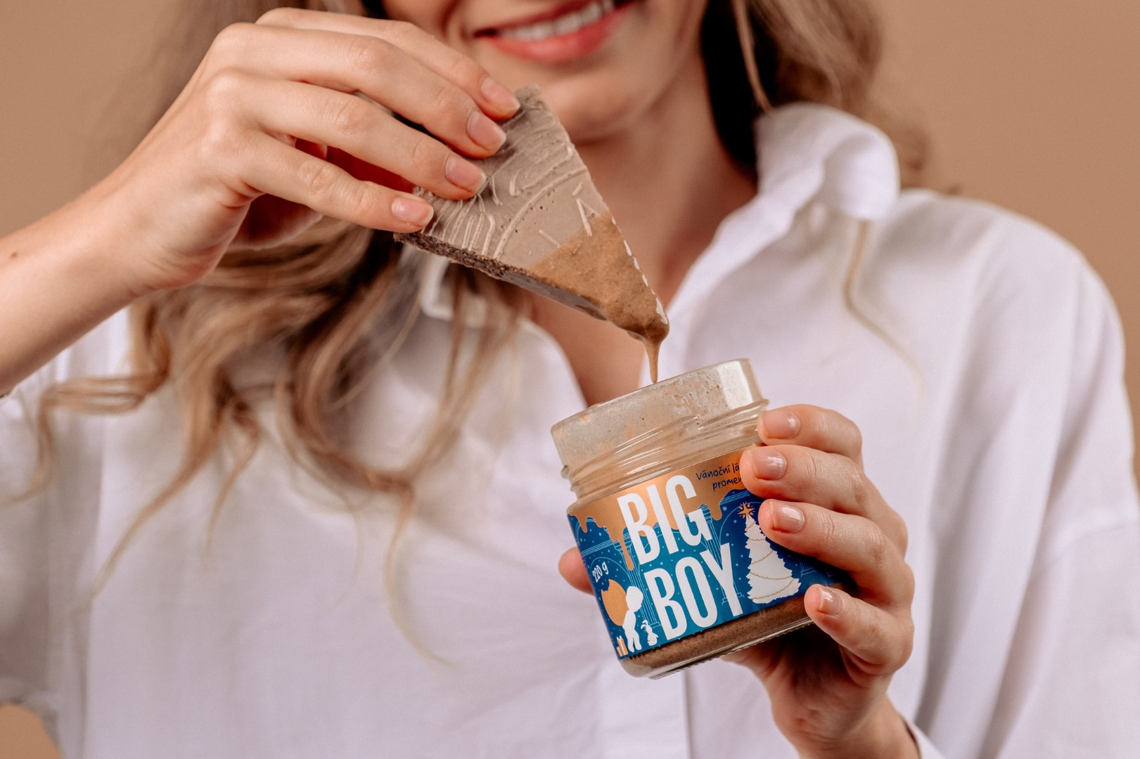 Spojili jsme pražené arašídy a lískové ořechy se skořicí a špetkou vanilky. Výsledkem je sladký oříškový krém, který voní po perníčkách a připomíná lázeňskou kolonádu provoněnou Vánocemi.