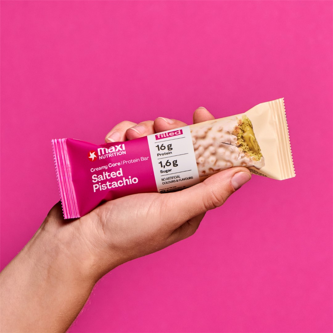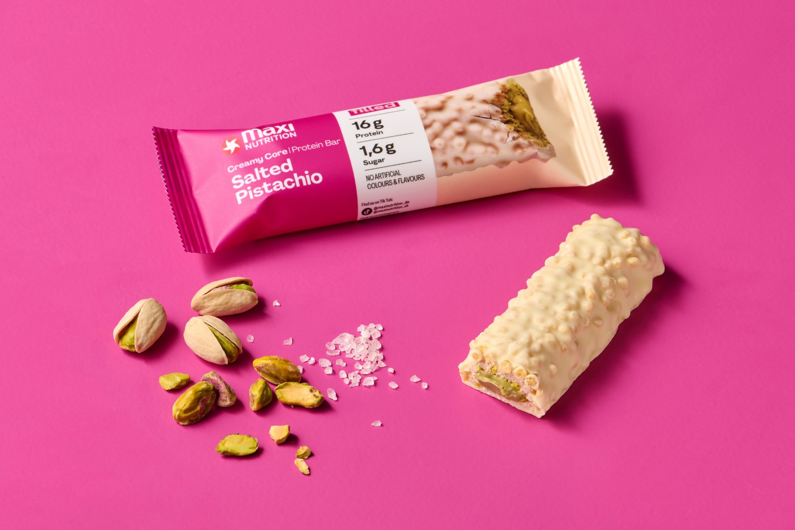 Proteinová tyčinka s 18 % pistáciového krému, 7 % sójových křupinek a potažená 33 % bílou čokoládou. S obsahem sladidel. Pistáciová příchuť.