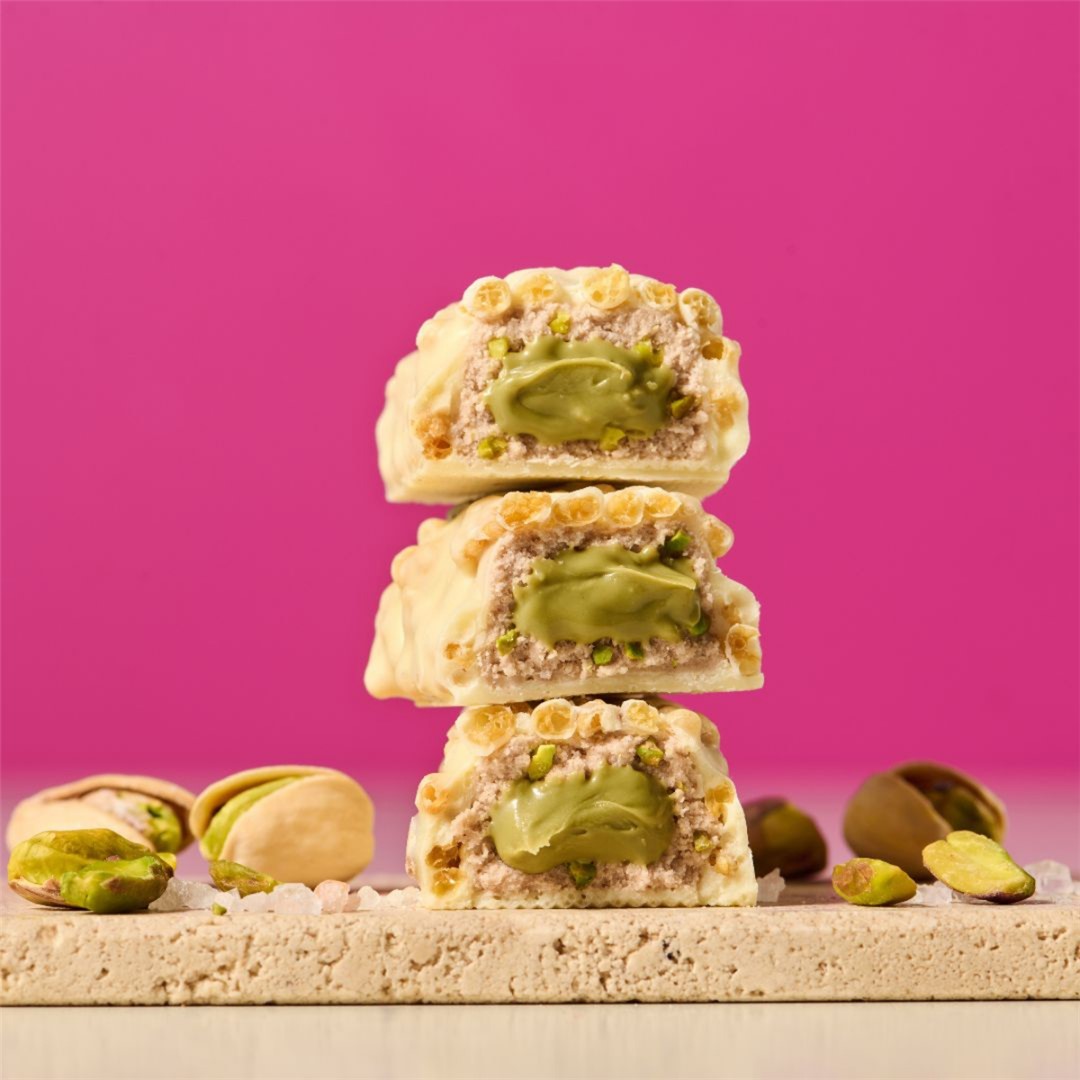 Proteinová tyčinka s 18 % pistáciového krému, 7 % sójových křupinek a potažená 33 % bílou čokoládou. S obsahem sladidel. Pistáciová příchuť.
