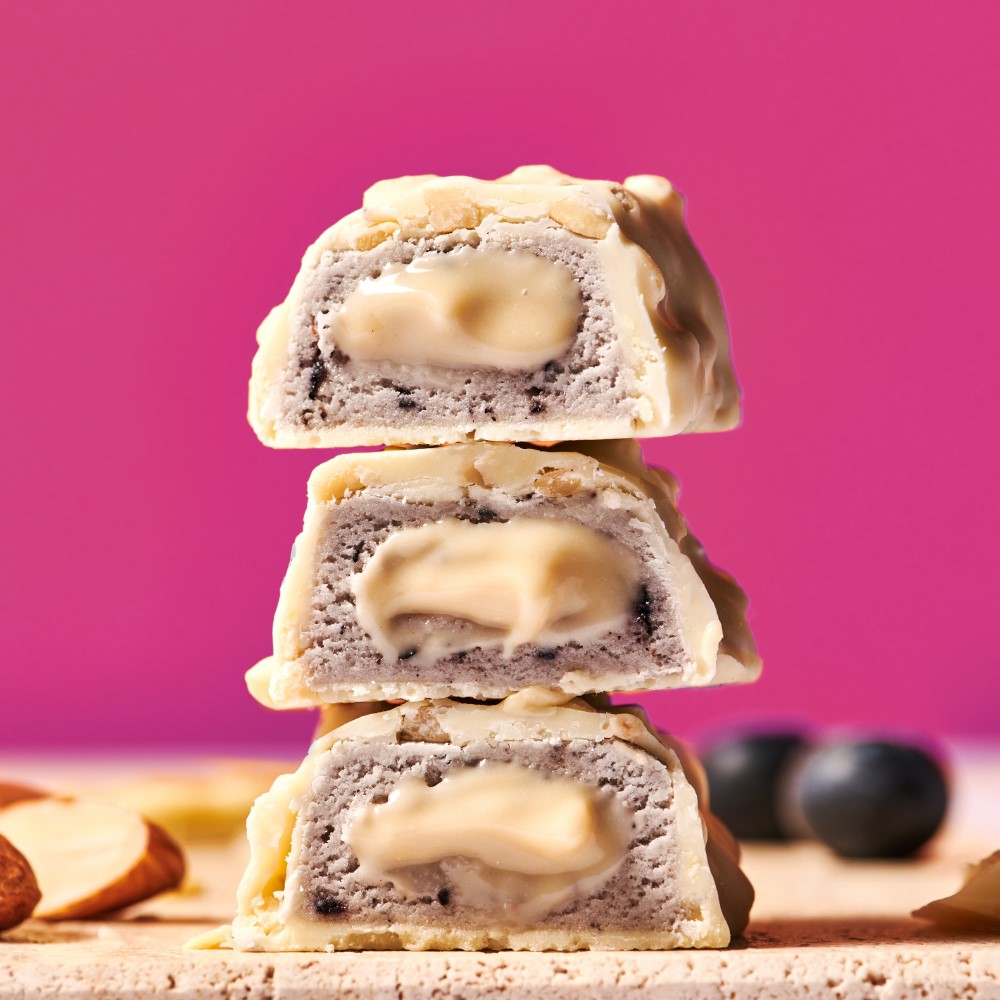Proteinová tyčinka s 12 % mléčné smetany, pokrytá 33 % bílé čokolády, 7 % pražených mandlí a 0,7 % borůvek. S použitím sladidel.