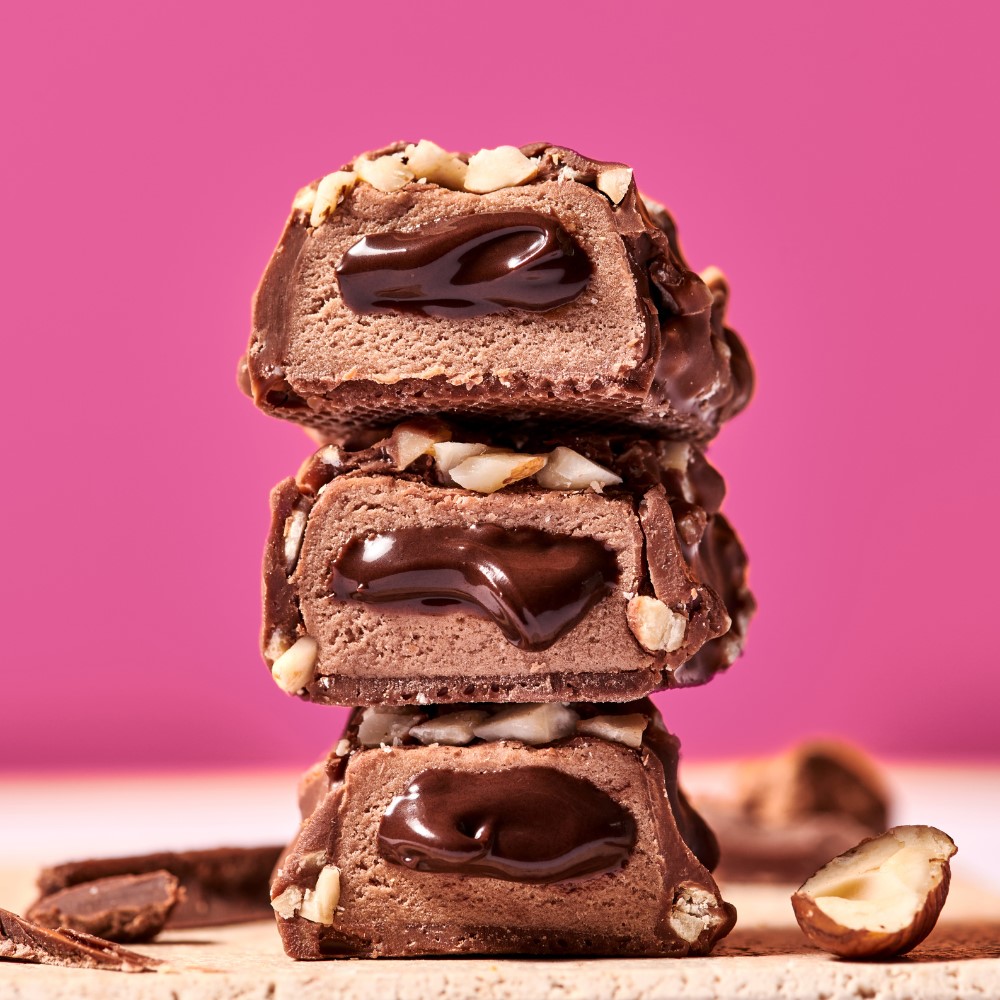 Proteinová tyčinka s 12 % oříškového nugátového krému, pokrytá 33 % mléčné čokolády a 7 % pražených lískových ořechů. S použitím sladidel.