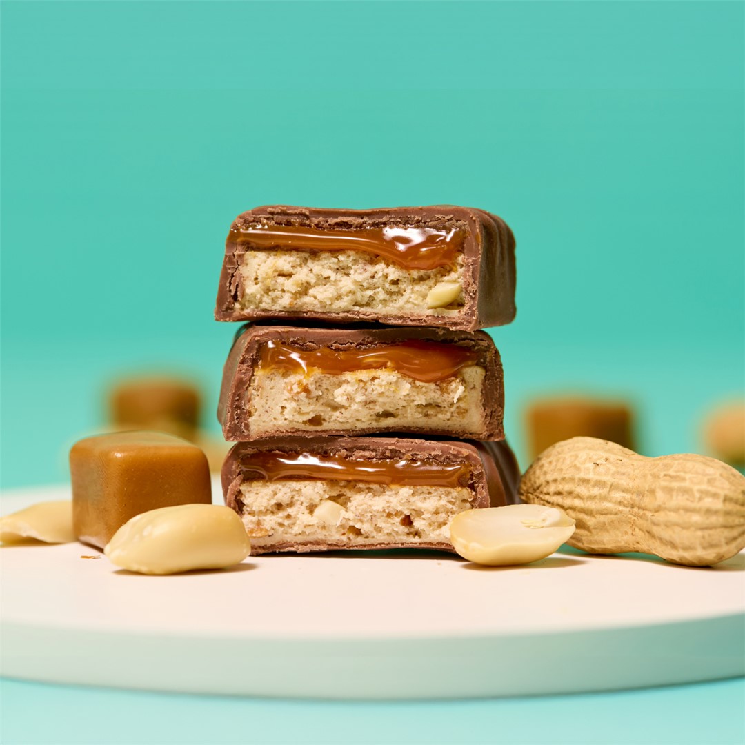 Proteinová tyčinka s 19 % vrstvou s příchutí karamelu, s 11% arašídy a potažená 27 % mléčnou čokoládou. Se sladidly. S příchutí arašídů.