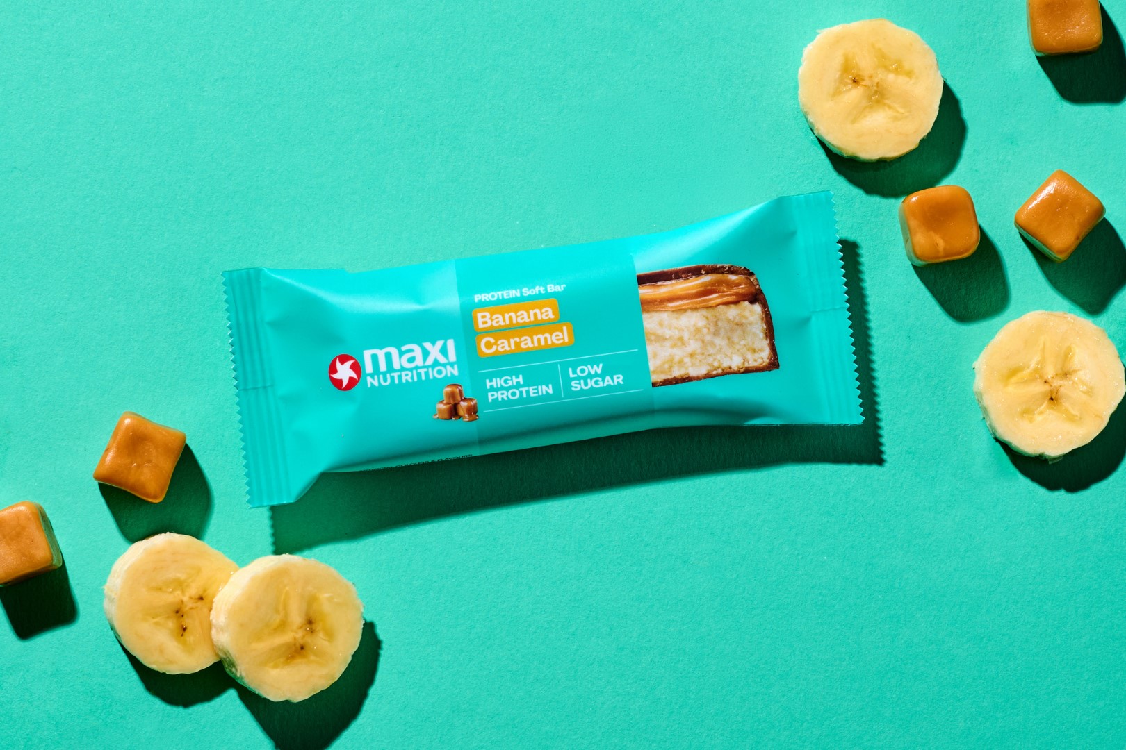 Proteinová tyčinka s 19% vrstvou s karamelovou příchutí a potažená 30% mléčnou čokoládou. S obsahem sladidel. S příchutí banánu.