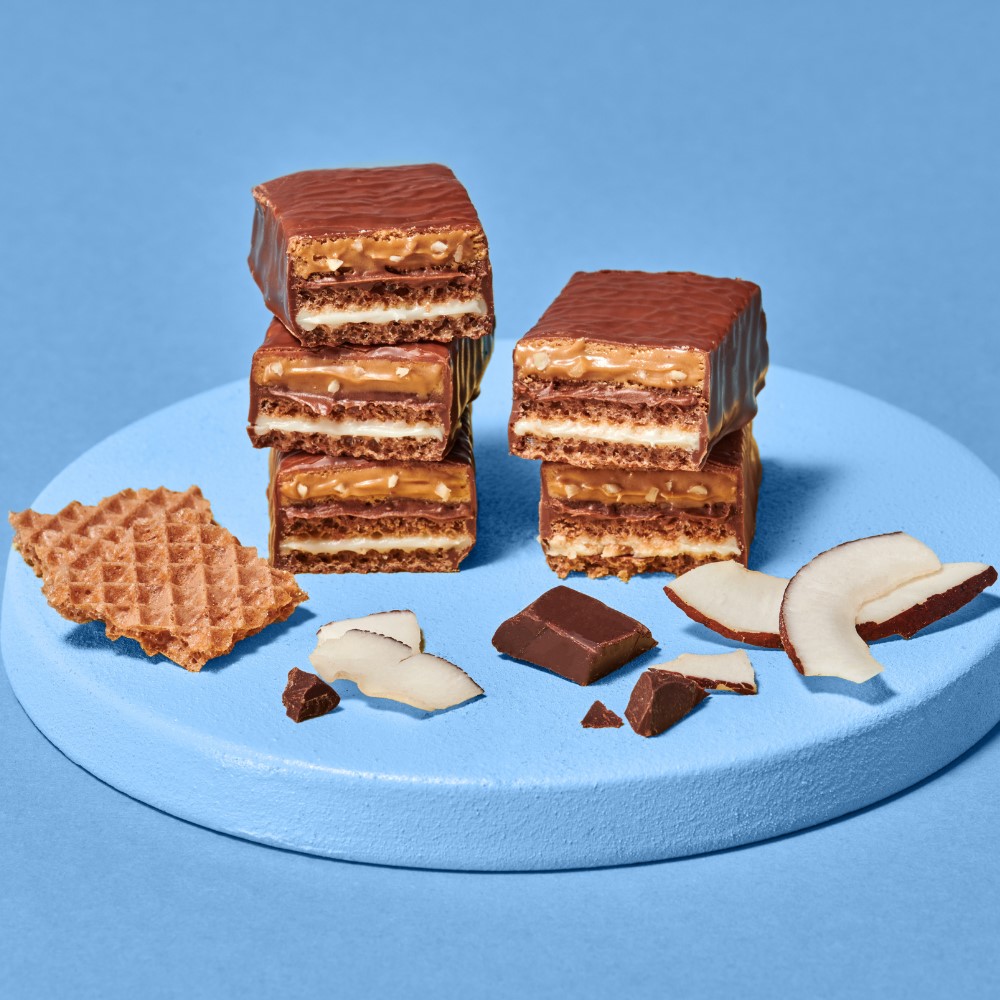 Vaflová proteinová tyčinka s 4 % kokosovými vločkami, pokrytá 28 % mléčné čokolády. Se sladidly.